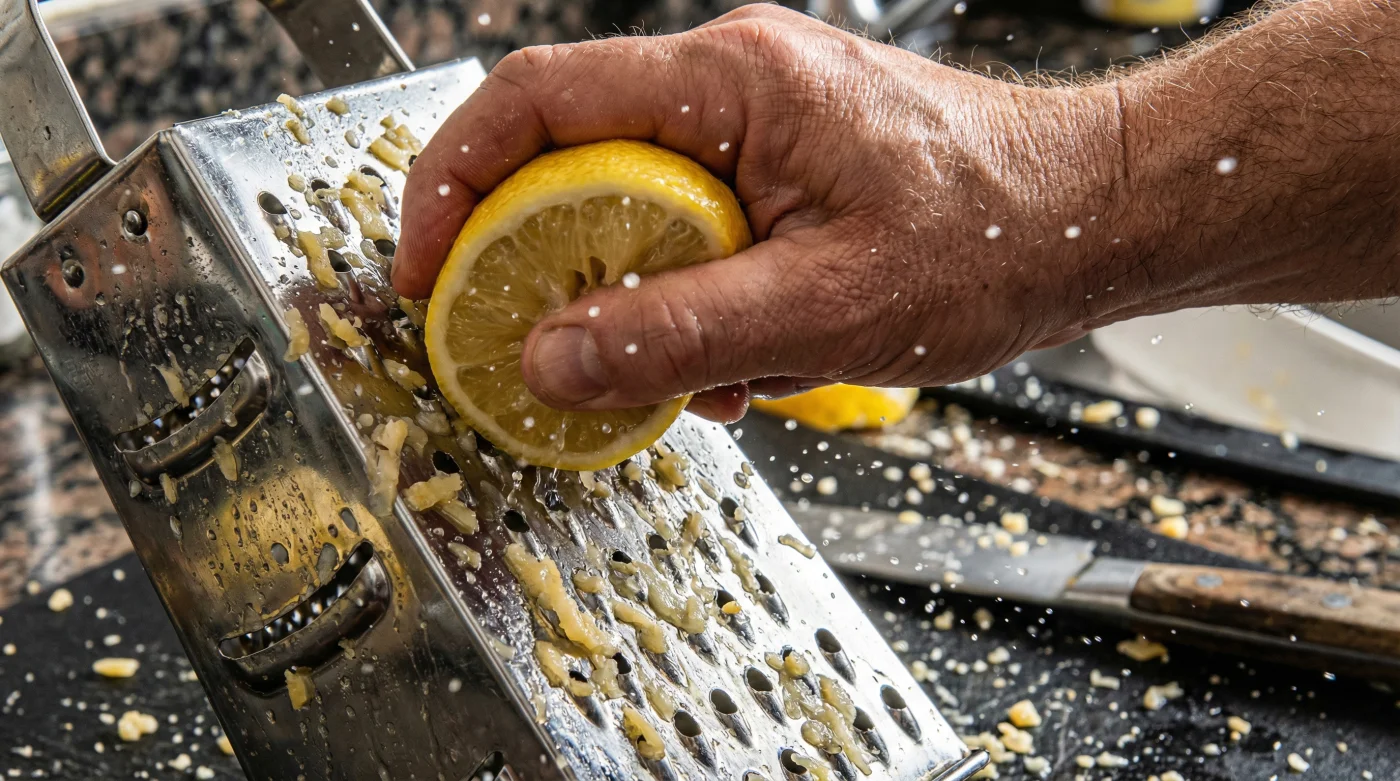 Wer eine feine Microplane für harten Pecorino oder Parmesan nutzt, hat meist mit winzigen, steinharten Resten zu kämpfen. Hier reicht es, die halbe Zitrone mit der Fruchtfleisch-Seite direkt über die Klingen zu ziehen. Immer in Reiberichtung arbeiten.