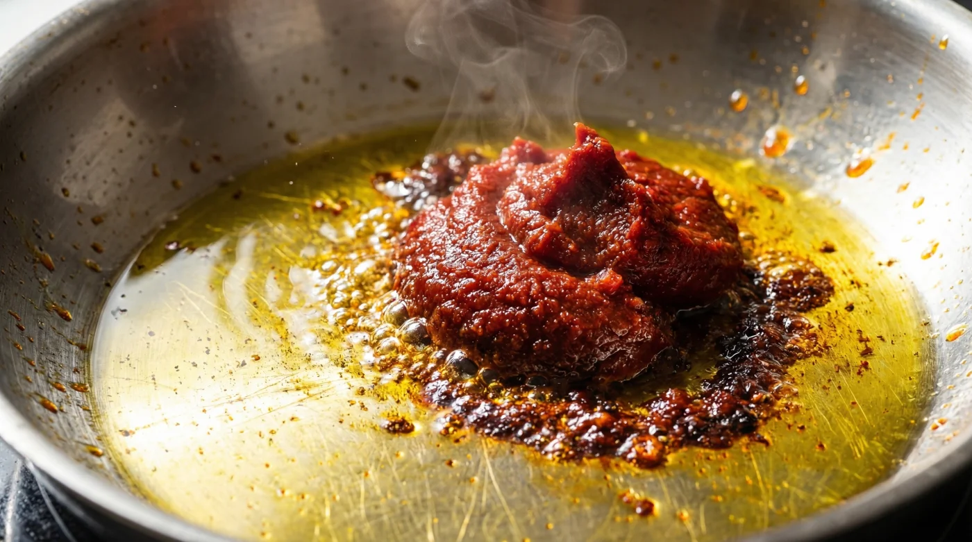 Rührst du es direkt in eine wässrige Soße, fängst du es dauerhaft in seinem rohen, säuerlichen Zustand ein. Wasser kocht bei 100 Grad Celsius – das ist viel zu kalt, um eine nennenswerte Karamellisierung der pflanzlichen Zuckerstoffe auszulösen. Die Paste benötigt zwingend die aggressive, wasserlose Umgebung von heißem Fett, das 150 Grad oder mehr erreicht, um ihre gerösteten, schweren Umami-Noten an das Gericht abzugeben.