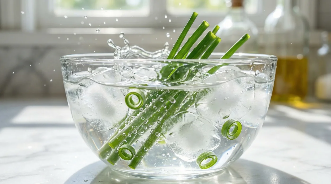 • Lass die Stücke unmittelbar in das Eisbad gleiten und beobachte, wie sich die Fäden sofort spannen und eindrehen.