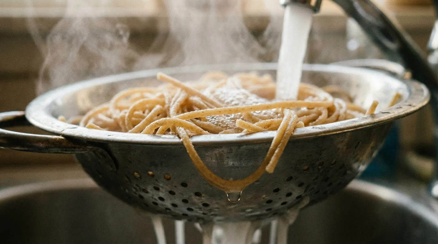 Es ist ein Geräusch, das fast jeden Feierabend begleitet. Das rhythmische Blubbern von kochendem Salzwasser, das an den Rändern des Topfes weiße Bläschen wirft. Du stehst mit dem Sieb am Spülbecken, greifst nach den Topflappen und gießt die dampfende Fracht ab. Dann greift eine alte, tief sitzende Gewohnheit: Der Wasserhahn wird aufgedreht. Ein eiskalter Strahl trifft auf die heißen Nudeln, der Dampf zischt auf. Du willst den Garprozess stoppen, damit nichts verklebt. Das hast du so gelernt.
