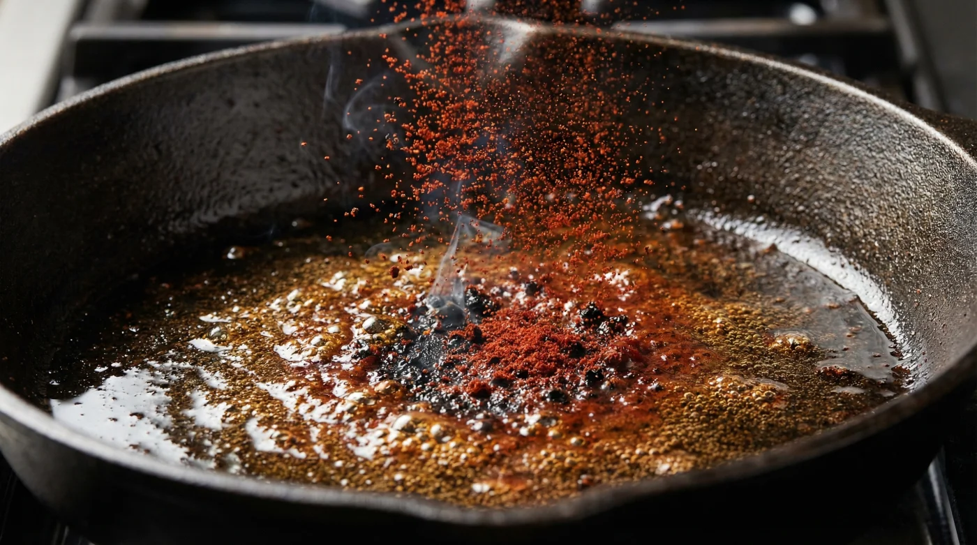 Um diesen Fehler zu beheben, musst du das Gewürz mit anderen Augen sehen. Paprikapulver ist kein harter Samen, sondern pulverisierte, in der Sonne getrocknete Frucht. Es steckt voller natürlicher, extrem empfindlicher Zuckerverbindungen. Wenn du dieses zarte Pulver in 180 Grad heißes Öl wirfst, ist das, als würdest du feinen Karamellstaub auf einen glühenden Grill streuen.