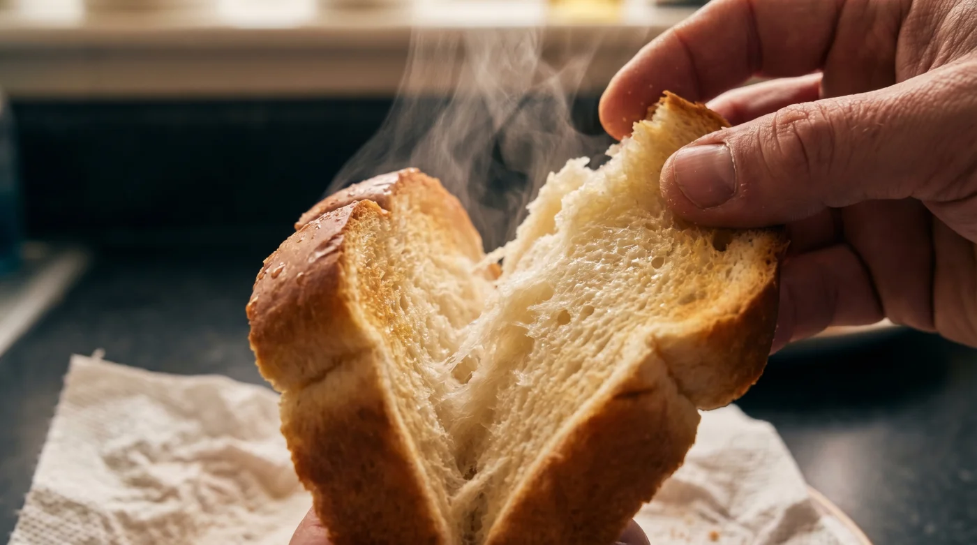 Sobald Sie das Brot aus der Mikrowelle entnehmen, entfernen Sie das Papier sofort und ohne Zögern. Der heiße Restdampf an der Oberfläche verdunstet an der kühleren Raumluft und verhindert so effektiv, dass die äußere Schicht klebrig und feucht bleibt. Wenn Sie zusätzlich eine knusprige Rinde bevorzugen, legen Sie die bereits dampfende und weiche Scheibe danach einfach für eine weitere Minute in den Toaster.