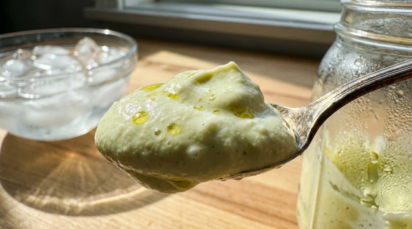 Stellen Sie sich vor, ein kalter Löffel gleitet durch eine dicke, blassgrüne Creme. Die Textur erinnert an eine reichhaltige, schwere Mayonnaise, doch sie glänzt sanft im gedimmten Licht Ihres Esszimmers. Wenn Sie ein Stück warmes, knuspriges Sauerteigbrot durch diese Masse ziehen, erwarten Sie instinktiv die drückende Schwere von Butter oder Sahne. Stattdessen trifft eine pfeffrige, grasige Frische Ihren Gaumen. Es ist der reine, unverfälschte Geschmack eines exzellenten Olivenöls, gebunden in einer Form, die langsam und luxuriös auf der Zunge schmilzt. Es sieht aus wie eine hochkomplexe Restaurant-Kreation, doch es ist pure Physik auf dem Teller.