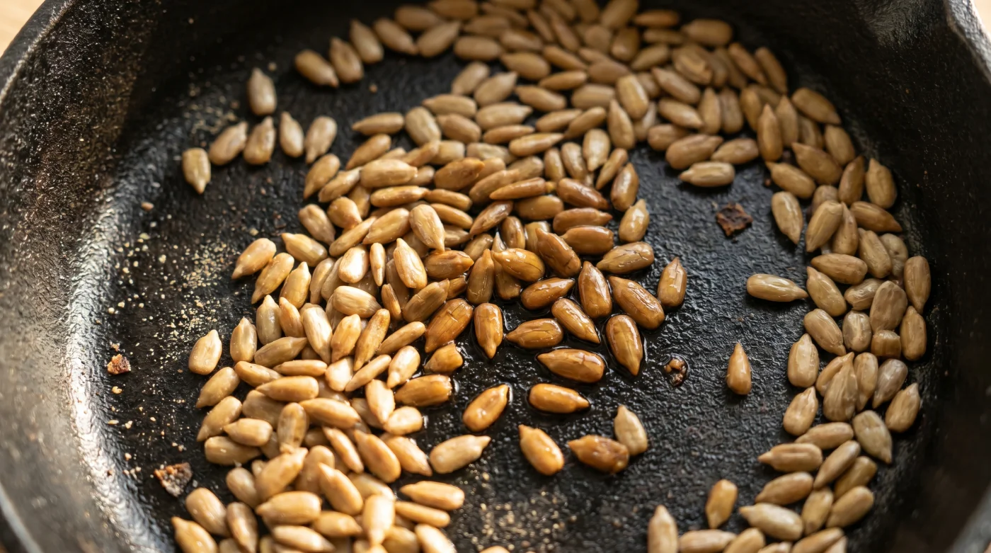 3. Die ständige Bewegung: Schwenken Sie die Pfanne ohne Pause. Die Hitze muss gleichmäßig von allen Seiten einwirken, da die flachen Seiten der Sonnenblumenkerne sonst sofort verbrennen.