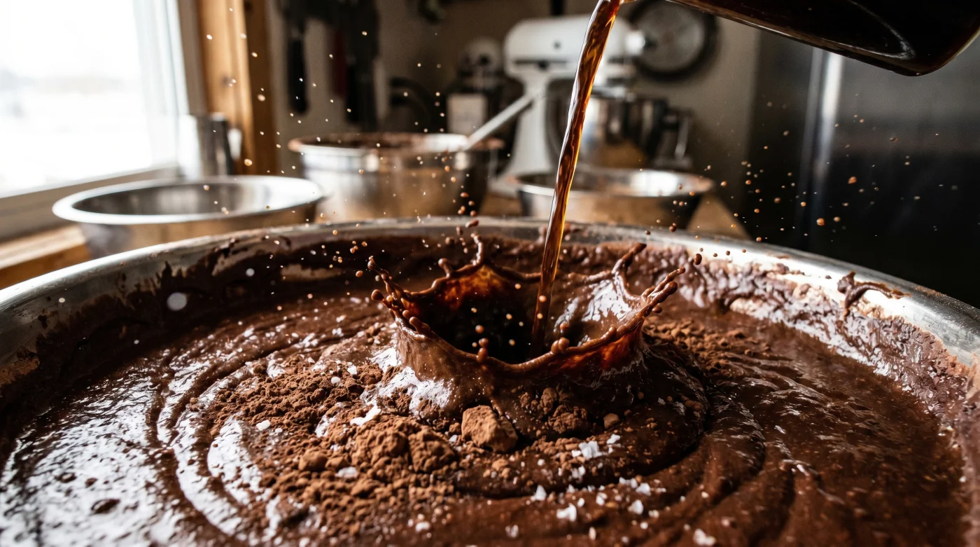 Der Schneebesen zieht zähe Spuren durch die tiefbraune Masse am Schüsselboden. Normalerweise greifen Sie jetzt zur Milchflasche oder zum kochenden Wasser. Doch heute kippen Sie den Rest des morgendlichen Filterkaffees direkt hinein – pechschwarz und exakt auf 18 Grad Celsius abgekühlt. Ein kurzes Zischen bleibt aus, die dunkle Flüssigkeit legt sich schwer und stumm auf den staubigen Kakao. Wenn sich die beiden Komponenten durch langsame Rotationen verbinden, schlägt Ihnen plötzlich ein Geruch entgegen, der viel eher an eine kalte, feuchte Rösttrommel als an eine klassische Süßspeise erinnert. Die Konsistenz verändert sich unter Ihren Händen sofort: Aus einer bröckeligen, klebrigen Paste wird ein seidig glänzender Teig, der dickflüssig vom Metall des Rührbesens tropft. Diese unscheinbare Zugabe aus der Kaffeekanne entscheidet exakt in diesem Moment über ein flaches Süßgebäck oder ein vollmundiges Aromaprofil, das noch lange am Gaumen haftet.