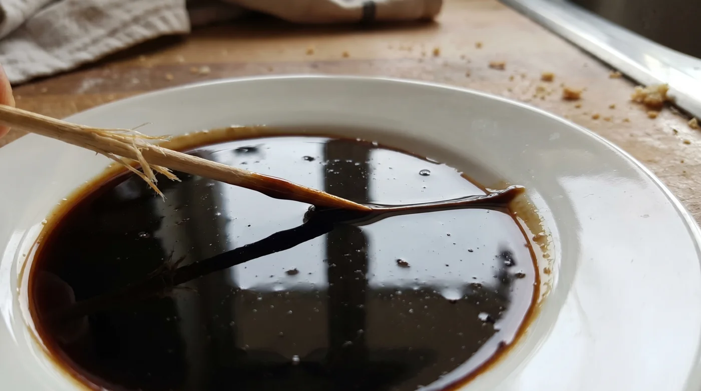 Stelle im Vorfeld unbedingt sicher, dass die Umgebungstemperatur des Tellers zur Viskosität der Creme passt. Auf eiskaltem Porzellan stockt die zuckrige Masse zu schnell und lässt sich nicht mehr ziehen, auf glühend heißem Tellern verläuft sie hingegen unkontrolliert zu einer unschönen Pfütze. Normale Raumtemperatur lässt die Textur der Balsamico Reduktion am verlässlichsten für dich arbeiten.