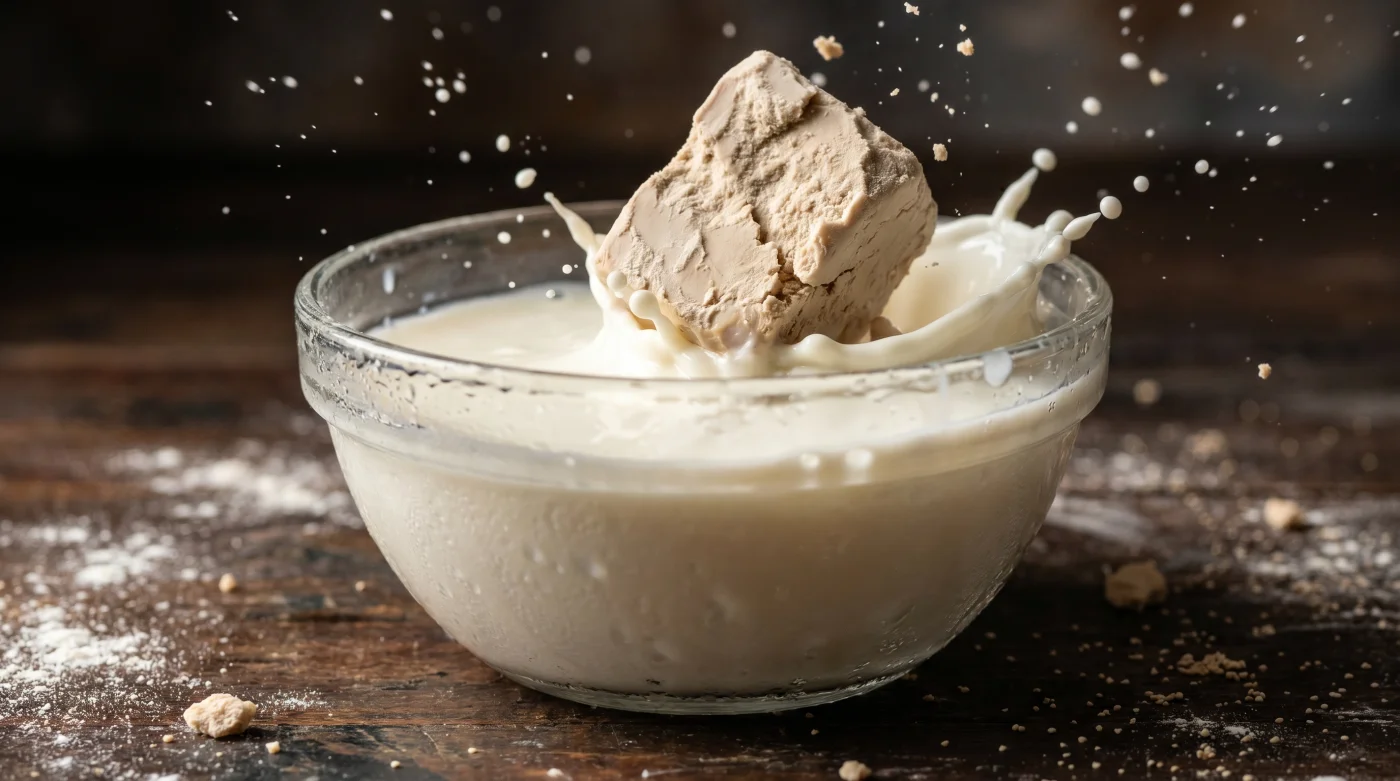 Stell dir frische Hefe nicht als träges Pulver vor, sondern als eine hochsensible Gemeinschaft mikroskopischer Arbeiter. Wenn du sie in warmes Wasser wirfst, zwingst du sie zu einem unkontrollierten, hektischen Sprint. Sie fressen den vorhandenen Zucker panisch auf, produzieren in rasantem Tempo Gasbläschen und brennen völlig aus, lange bevor das Glutengerüst des Mehls die Chance hatte, sich zu einer widerstandsfähigen, elastischen Kuppel zu formen.