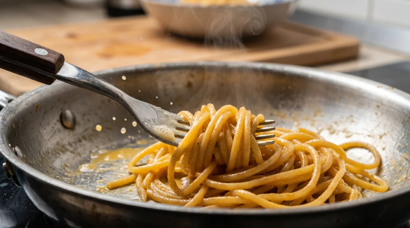 Das Taktische Toolkit für Zuhause ist denkbar einfach: Hebe pro 250 Gramm trockener Pasta immer etwa 100 Milliliter Kochwasser auf. Nutze zum Erwärmen konsequent mittlere Hitze, etwa Stufe 5 von 9 auf einem Standardherd. Verzichte auf stark beschichtete Pfannen, wenn du die Wahl hast; in schwerem Edelstahl oder Gusseisen baut sich eine weitaus bessere Emulsion auf, da die Sauce mehr mechanische Reibung am Boden erfährt.