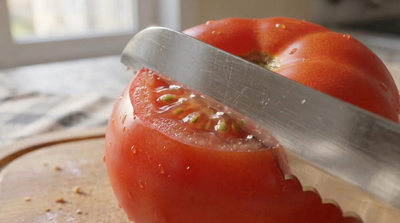 Die Klinge berührt die straffe Haut. Du drückst leicht nach unten, doch anstatt sanft hindurchzugleiten, gibt die Frucht nach. Ein leises, nasses Knirschen verrät das Drama: Roter Saft überflutet das Schneidebrett, während die innere Struktur der Tomate unwiderruflich kollabiert.