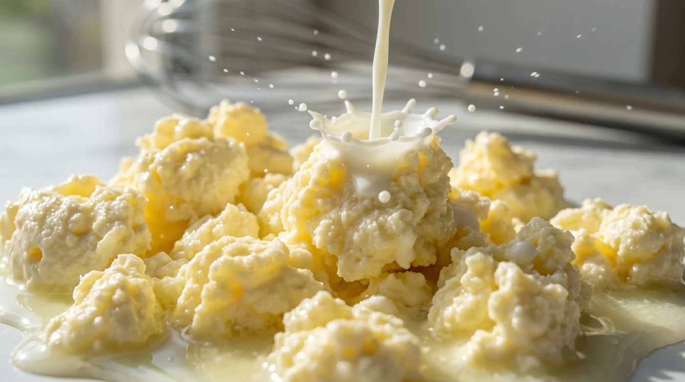 Wenn du nun eiskalte, flüssige Milch hinzugibst, lieferst du den Molekülen genau die Feuchtigkeit und Flexibilität zurück, die sie gerade verloren haben. Die kalte Temperatur verhindert, dass das Fett weiter schmilzt, während die frischen Proteine aus der Milch als Vermittler auftreten. Sie schieben sich sanft zwischen die verklebten Fettklümpchen und lösen die starre Umklammerung.