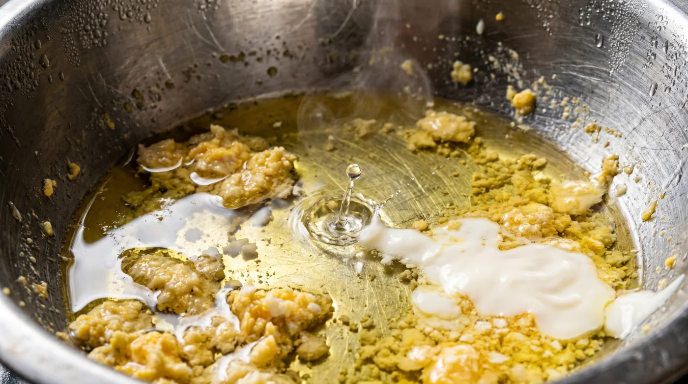 Es ist, als würdest du einen stotternden Motor nicht komplett austauschen, sondern lediglich den Keilriemen mit einem gezielten Handgriff neu spannen. Die plötzliche Hitze verringert die Oberflächenspannung des Öls drastisch. Es wird weicher, flüssiger und deutlich nachgiebiger. Ein Teelöffel kochendes Wasser am Rand der Schüssel erzeugt einen frischen, heißen Ankerpunkt, an dem sich die Emulsion wie aus dem Nichts wieder neu aufbauen kann.