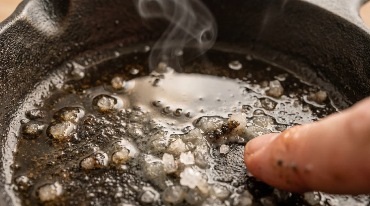 Dieser fast schon meditative Vorgang verändert deine gesamte Küchenroutine auf eine Weise, die sich sofort richtig anfühlt. Die harten Salzkristalle wirken wie winzige, intelligente Schaber. Sie lösen das angebrannte Protein vom Boden, ohne die empfindliche Patina zu zerkratzen, und saugen gleichzeitig das überschüssige, ranzige Fett auf wie ein trockener Schwamm am Strand.