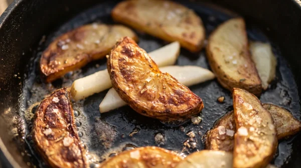 Für die schnelle Feierabendküche wählst du einen etwas flacheren Winkel. Wenn du das Gemüse nach jedem Schnitt nur um ein Viertel drehst, entstehen breitere, offene Flächen. Diese eignen sich hervorragend, um in einer heißen Gusseisenpfanne mit etwas Butter und einem Zweig Thymian in wenigen Minuten knusprig zu braten. Die breite Fläche fängt das Fett auf, die Kanten bräunen sofort.